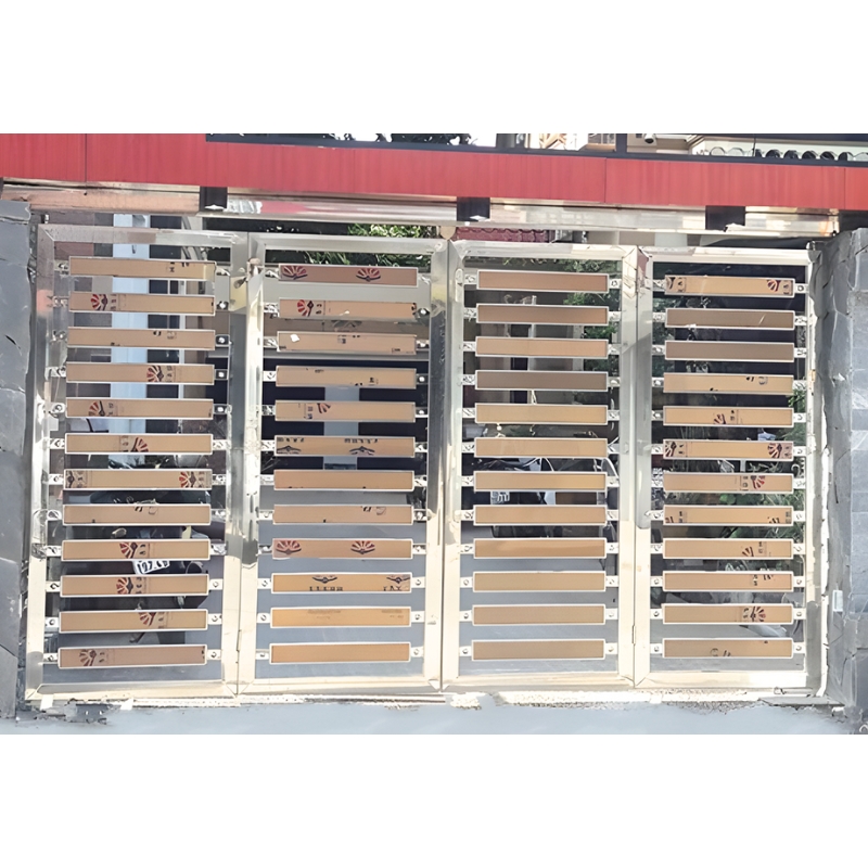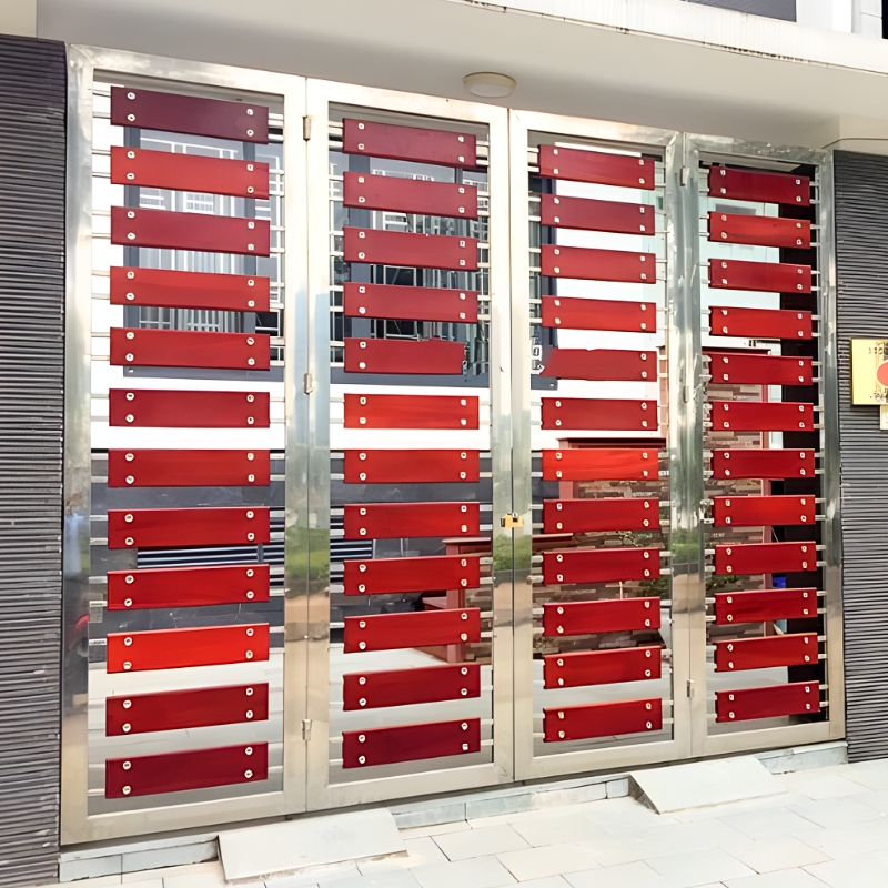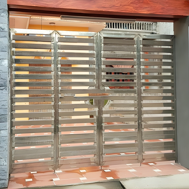 Cửa inox 2 cánh có thể kết hợp nan hoa văn, ô kính, hoa văn laser, hoặc phun sơn tĩnh điện theo yêu cầu, giúp tạo điểm nhấn tinh tế cho mặt tiền ngôi nhà.