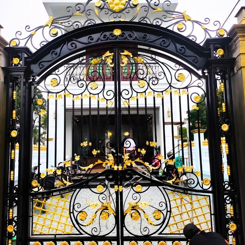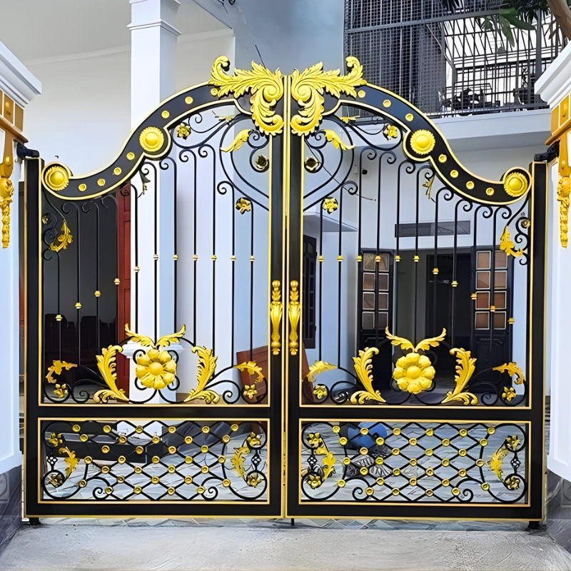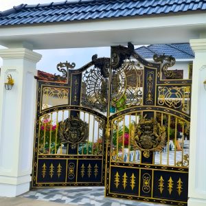 Màu sơn đen – vàng ánh kim mang phong cách hoàng gia châu Âu, giúp tổng thể cổng trở nên nổi bật và sang trọng.