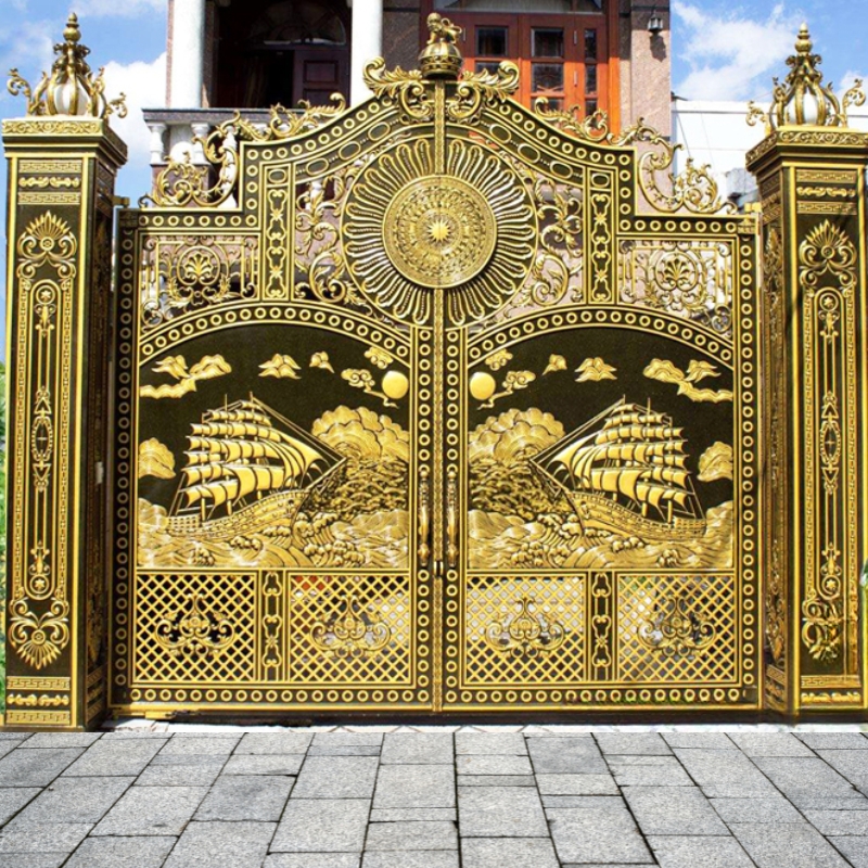 Cửa cổng sắt mỹ thuật NVP-04 là một trong những thiết kế đẳng cấp bậc nhất của Cơ Khí Nam Việt Phương, lấy cảm hứng từ phong cách kiến trúc lâu đài châu Âu. Mẫu NVP-04 gây ấn tượng mạnh bởi hình khối vững chãi, họa tiết chạm nổi cầu kỳ và màu vàng đồng sang trọng, biểu tượng của quyền quý và thịnh vượng.
