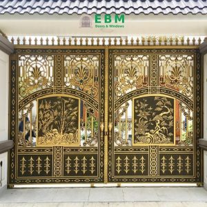 • Khung kết cấu kiên cố, bản lề và trục xoay gia công chuyên biệt giúp cổng vận hành êm và chắc chắn.