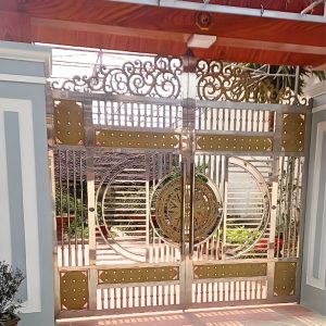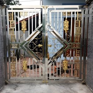 Cửa inox 2 cánh có thể kết hợp nan hoa văn, ô kính, hoa văn laser, hoặc phun sơn tĩnh điện theo yêu cầu, giúp tạo điểm nhấn tinh tế cho mặt tiền ngôi nhà.