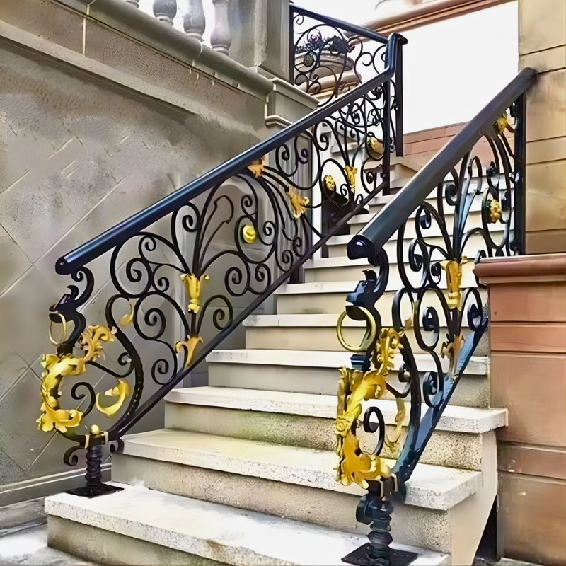 • Mẫu lan can sắt cổ điển: Hoa văn nghệ thuật uốn lượn, kết hợp sơn đen – vàng đồng sang trọng.